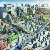 A modern, well-lit industrial facility showcasing various sustainable waste management solutions in the UK. In the foreground, automated sorting machines and conveyor belts efficiently process recyclable materials. In the middle ground, workers in protective gear operate specialized equipment, demonstrating the integration of technology and human labor. In the background, rows of storage silos and an array of solar panels on the roof highlight the facility's commitment to renewable energy. The overall scene conveys a sense of innovation, efficiency, and environmental responsibility within the UK's solid waste management industry.