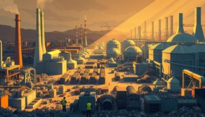 A-vast-industrial-landscape-of-British-waste-treatment-facilities-with-towering-smoke-stacks-